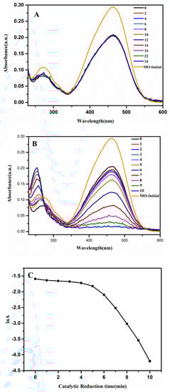 To understand the catalytic effect of Ag@Cu2O–Pt on dye pollutants, MO was selected as the catalytic target. In this catalytic experiment, the catalytic effect of Ag@Cu2O–Pt is characterized by changes in the MO concentration. Under the action of NaBH4, the 460 nm absorption peak of MO gradually disappeared and a new absorption peak appeared at 260 nm, which indicates that MO had degraded and a new product had formed (Figure 6B). The Ag@Cu2O–Pt nanoparticles exhibit excellent catalytic performance compared with that of the Ag@Cu2O nanoparticles, which were barely able to catalyze MO (Figure 6A). This is because the porous structure of the Ag@Cu2O–Pt surface has good adsorptivity towards the dye molecules and better MO adsorption onto the catalyst surface facilitates completion of the catalytic process. Pt itself has a good catalytic performance, which promotes the reactivity of the catalytic process. Therefore, Pt-decorated Ag@Cu2O nanoparticles improved the catalytic activity compared to that of the uncoated nanoparticles.