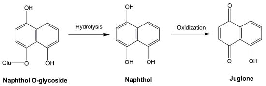 The first verified allelochemical was juglone, a 1,4-naphthoquinone, which originates from black walnut (Juglans nigra) []. Black walnut is a woody species that interferes with understory plants. This allelopathic phenomenon was recorded thousands of years ago, but the allelochemical juglone was only isolated and identified several decades ago [,]. In black walnut, juglone occurs in a non-toxic naphthol O-glycoside form. The naphthol O-glycoside biosynthesized in living tissues may be released from leaves, barks, and roots to the environment. The naphthol O-glycoside is rapidly transformed into aglycone, a less phytotoxic naphthol, by hydrolysis or soil microbial interactions, and then oxidized to phytotoxic juglone []. The phytotoxic juglone is formed from non-toxic naphthol O-glycoside by environment interactions once released (Figure 1).