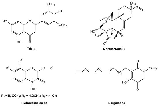 Allelopathic weeds produce and release allelochemicals that affect crop plants. Fortunately, a few crop cultivars are allelopathic as well, which results in a natural inhibition of weeds. These allelopathic crop cultivars have been investigated and identified from several germplasm collections, particularly for the principal grain crops rice and wheat [,,,,]. Allelopathic crop cultivars can produce and release their own ‘herbicides’ (i.e., allelochemicals) to suppress weeds, permitting ecological weed control. Therefore, much effort has gone into investigating and determining allelochemicals from allelopathic crop cultivars. Thus far, the key allelochemicals from allelopathic cultivars of the principal grain crops have been identified, such as tricin and momilactone B from rice (Oryza sativa) [,], benzoxazinoid hydroxamic acids from wheat (Triticum aestivum) and maize (Zea mays) [], and sorgoleone from sorghum (Sorghum bicolor) (Figure 3) [].