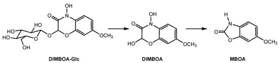 Tricin (5,7,4′-trihydroxy-3′,5′-dimethoxyflavone) and momilactone B are important allelochemicals that have been discovered from allelopathic rice cultivars and many plant species [,]. In particular, allelopathic rice seedlings biosynthesize 5,4′-dihydroxy-3′,5′-dimethoxy-7-O-β- glucopyranosyl-flavone and 7,4′-dihydroxy-3′,5′-dimethoxy-5-O-β-glucopyranosyl-flavone. Two flavone O-glycosides are exuded from allelopathic rice roots to the environment and are then transformed into their aglycone form, 5,7,4′-trihydroxy-3′,5′-dimethoxyflavone (i.e., tricin) to exert allelopathic effects on paddy weeds and soil microorganisms []. Similarly, allelopathic wheat seedlings biosynthesize 2-(2,4-dihydroxy-7-methoxy-1,4-benzoxazin-3-one)-β-D-glucopyranose (DIMBOA-Glc), which is stored in vacuoles. When leached from the roots to the soil, DIMBOA-Glc is rapidly transformed to its aglycone 2,4-dihydroxy-7-methoxy-1,4-benzoxazin-3-one (DIMBOA) and then 6-methoxy-benzoxazolin-2-one (MBOA) (Figure 4) [,]. DIMBOA and MBOA are the dominant allelochemicals in wheat-weed allelopathic actions. They can effectively suppress weeds that reassociated with wheat crop. MBOA has relatively broad-spectrum bioactivity when compared with DIMBOA, and it is more resistant toward degradation in soil [,].