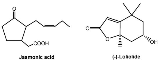 Root-secreted strigolactones and flavones mediate belowground signaling interactions among plant species or plants with symbiotic microbes. However, strigolactones and flavones do not appear to have a universal role in belowground signaling interactions, and thus there may be other soil-borne signaling chemicals awaiting identification. Jasmonic acid (Figure 8) is a ubiquitous signaling chemical that elicits the production of defensive metabolites in plants [,,]. A few studies have documented root-secreted jasmonic acid and its roles in belowground signaling interactions [,]. A recent study shows that the most ubiquitous lactone, (-)-loliolide (Figure 8), is involved in belowground signaling interactions. Allelopathic wheat plants can detect and recognize the root-secreted (-)-loliolide from their interacting plant species and then respond by increased allelochemical DIMBOA. More importantly, (-)-loliolide was found in more than 100 plant species and their rhizosphere soils. (-)-Loliolide has good soil mobility and it appears to be a soil-borne signaling chemical for plant recognition and allelochemical response in belowground interactions, being potentially common to all species []. Similarly, (-)-loliolide stimulates accumulation of defensive metabolites that are involved in plant against pathogens and herbivores [,]. Therefore, (-)-loliolide may be a ubiquitous, soil-borne signaling chemical in belowground ecological interactions between plants and other organisms. The regulatory network of jasmonic acid in plant defenses has been well established [,,]. However, the regulatory network of (-)-loliolide as a signaling chemical in plant defenses has not yet been established. The discovery of (-)-loliolide as a common soil-borne signaling chemical, as well as a further understanding of its potential mechanisms in belowground signaling interactions, should lead to new insights into plant chemical defense strategies.