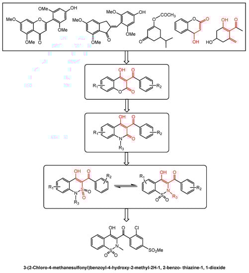 Allelochemicals, as new herbicide discovery efforts, may be of particular value for weed management in cropping systems [,,,]. Several allelochemicals, such as sorgoleone and tricin, have been synthesized and further modified in the past decades [,,,]. In recent years, the importance of allelochemical tricin for an allelochemical-based herbicide discovery has received a great deal of attention [,,]. Tricin may be synthesized by aldol condensation of α-chloro-2-hydroxy acetophenone with aromatic aldehyde in aqueous alcoholic solution. Unexpectedly, this synthesis approach primarily yielded aurone, an isomer of tricin. This isomer had much stronger activity on weeds and pathogens than tricin itself [,], which indicated that the aurone isomer is an effective molecule for new herbicide discovery. In this context, there has been much effort in designing aurone-based herbicides. A series of aurone-derived compounds, including substituted aurones and benzothiazine derivatives, have been synthesized [,,]. These derivatives showed highly strong bioactivities on weeds. In particular, several (2-benzoylethen-1-ol)-containing 1, 2-benzothiazine derivatives had good pre-emergent activities against weeds and inhibited HPPD interfering with photosynthesis. In addition, 3-(2-chloro-4-methanesulfonyl)-benzoyl-4-hydroxy-2-methyl-2H-1, 2-benzo-thiazine-1, 1-dioxide (Figure 9) completely inhibited the germination and growth of barnyardgrass, even at very low concentrations [,]. Therefore, the benzothiazine derivative was identified as a target compound for an allelochemical-based herbicide discovery effort.