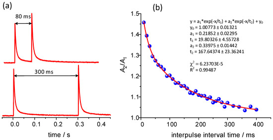 A similar phenomenon was observed for the photoelectrodes made of nanocrystalline cadmium sulfide (Figure 3). Like in the case of multiwalled carbon nanotubes (MWCNT)-CdScomposite [20], when the interval between light pulses is sufficiently long (over 300 ms for this study) the subsequent photocurrent spikes are unafected by previous states the device was in. However, if the interval between irradiations becomes shorter (e.g., 80 ms) the amplifiation of the second photocurrent response becomes significant. Detailed analysis reveals that the ratio of pulse intensities (the facilitation rate) vs. the time interval between stimuli is best fitted with a biexponential function (1):