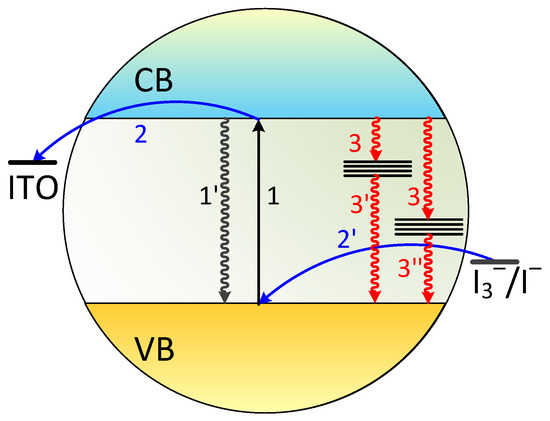 The overall mechanism of photocurrent generation and spikes amplification is summarized in Figure 4. The photoexcitation leads to the electrons transition from the valence to the conduction band (1) and the electron-hole recombination occurs spontaneously afterwards (1’). Electrons in the conduction band can be subsequently transferred through the interface to the conducting substrate (2) and holes can migrate to the surface and react with redox mediators in the electrolyte (2’). At the same time a fraction of electrons from the conduction band becomes trapped within interband states in a very fast process (3). This process efficiently competes with the interfacial electron transfer (2), but once the traps are filled this pathway becomes inactive. The trapped electrons undergo relaxation with the time constants τ1 (3’) and τ2 (3’’).