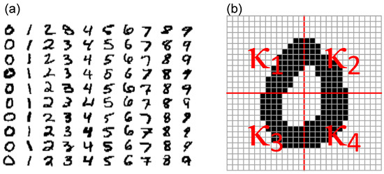 A small sample of the MNIST handwritten digits (a) and an image depicting the definition of quadrants for the 28 × 28-pixel image (b).