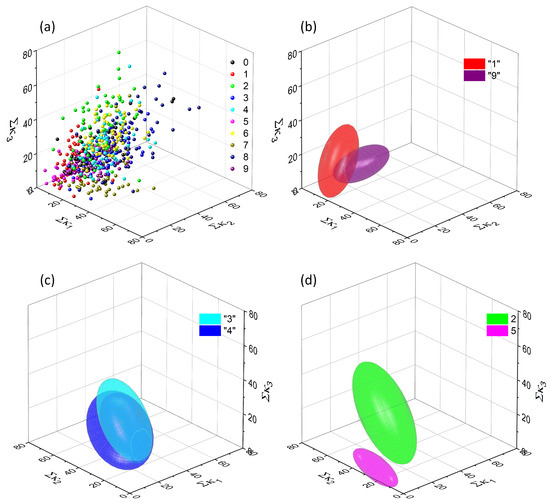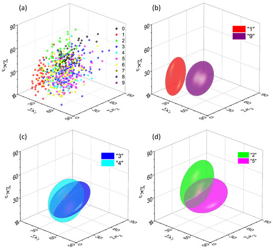 The collection of data points representing all 600 characters under consideration for combination of quadrants is shown in Figure 6a and the fitted ellipsoids in Figure 6b,c. It can be noticed, that the applied analysis procedure provides a rather poor separation, as the fitted ellipsoids excessively overlap in most of the cases, with the exception of “1” and “9” pair. This result is fully consistent with the initial assumption—simple pixels counting cannot serve as an efficient method for handwritten character recognition.