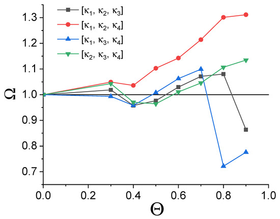 The dependence of the integral separability index Ω vs. the threshold value Θ. The horizontal line indicates the integral separability values determined for the input data. Threshold Θ = 0 corresponds to unprocessed input data.