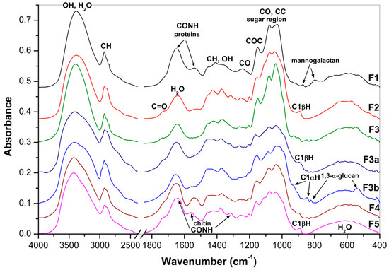 FTIR spectra of the polysaccharidic fractions F1–3, F3a, F3b, F4 and F5.
