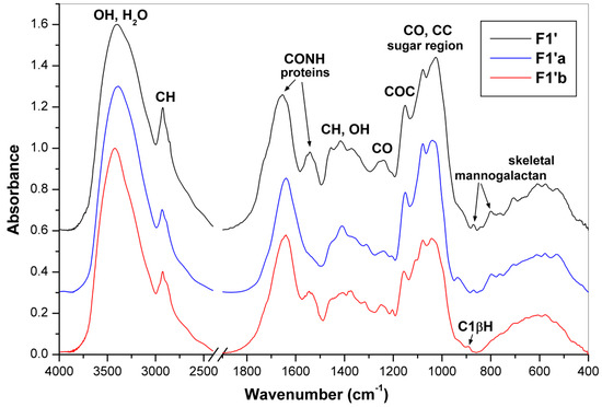 FTIR spectra of the polysaccharidic fractions F1′, F1′a and F1′b.
