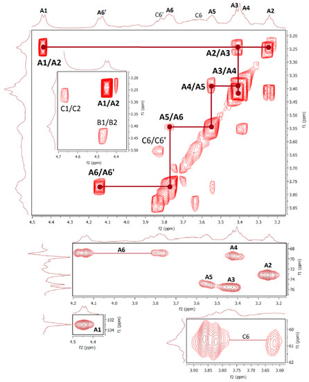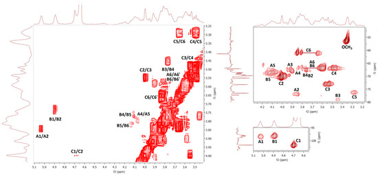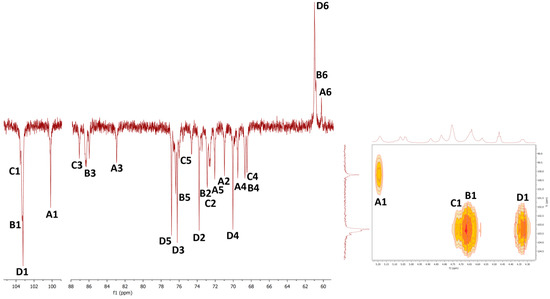 NMR spectra of water-soluble fractions F1 and F2 were measured in D2O at 20 °C and 80 °C, respectively. Correlation NMR spectra of purified F1 (Figure 3) were assigned to three main sugar residues identified as 1,2,6- and 1,6-linked α-galactoses (A and B units) and terminal β-mannose (C unit). Therefore, the main polysaccharide of this fraction was defined as a highly branched mannogalactan having 1,6-linked α-galactose units in the backbone and terminal β-mannose attached to O-2 position of some galactoses [18,31]. In addition, methoxy groups were found to be attached at the O-3 position of non-substituted α-galactose in the backbone. By contrast, fraction F2 was defined as 1,6-linked β-d-glucan because of the pronounced resonances of 1,6-linked β-glucose (A) (Figure 4), but in contrast to linear (1→6)-β-glucan previously isolated from a somatic hybrid of Pleurotus florida and Volvariella volvacea [43], this polysaccharide was slightly branched at the O-3 position, as evident from the resonance signals of two minor units assigned as 1,3,6-linked (B) and terminal (C) β-glucoses.