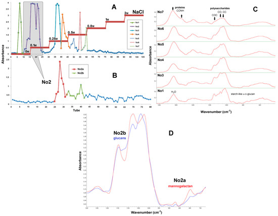 Results of chromatographic separation of water-soluble polysaccharides obtained from basidiocarps of P. ostreatus by extraction with hot water (F1′a, soluble in cold water) are described in Figure 7 (chromatograms, FTIR spectra of sub-fractions) and Figure 8 (1H NMR spectra). Firstly, polysaccharides and proteins were separated according to their electrostatic interactions with the cationic stationary phase, yielding seven sub-fractions No1–7 (Figure 7A). Secondly, the polysaccharides of the main sub-fraction No2 (tubes 10–25) were separated according to their molecular size on gel column, yielding two sub-fractions No2a (tubes 25–32) and No2b (tubes 32–42) with increasing molecular weights (Figure 7B). FTIR spectra of the sub-fractions are shown in Figure 7C,D. The spectrum of the first sub-fraction No1 (tubes 5–10) (Figure 7C) has several bands at 1240, 1154, 1080, 1025, 931, 852, 761, 707, 608, 579 and 529 cm−1 typical for starch-like (1→4)(1→6)-α-d-glucan [46]. These bands are absent in the spectra of sub-fractions No3–7 (tubes 24–61), which also demonstrate pronounced absorbance of carbohydrates at 1200–950 cm−1 (the “sugar region”). For sub-fractions No3–7, two characteristic bands of the amide vibrations in proteins near 1650 cm−1 (amide I) and 1645 cm−1 (amide II) [38] in comparison with the “sugar region” showed gradual increases with the elution time, so the protein contribution in these fractions should increase as well. Consequently, the first stage of chromatographic purification led to the removal of a certain amounts of starch-like α-d-glucan and proteins from the main sub-fraction No2, which was subjected to subsequent purification on the second column. The FTIR spectra of the resulting sub-fractions No2a and No2b (Figure 7D) demonstrated significant differences in the envelope of the “sugar region” 1200–950 cm−1, which is very sensitive to the composition and structure of polysaccharides, and in the next spectral region of 950–750 cm−1 containing bands of skeletal vibrations sensitive to anomeric configuration of sugar units. Indeed, the spectrum of No2a has two bands of mannogalactans at 874 and 800 cm−1 [39], while the spectrum of No2b has no pronounced bands in this region.