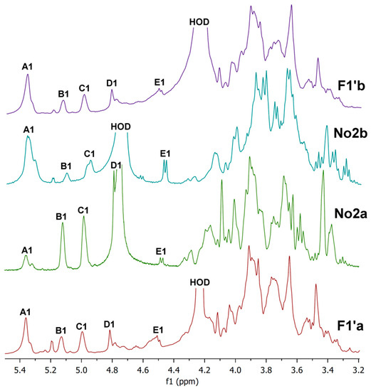 Proton NMR spectra of hot water extracts (cold soluble and insoluble), cold-water-soluble (F1′a), cold-water-insoluble (F1′b) parts and sub-fractions No2a and No2b of the hot water extract F1′ are shown in Figure 8. Spectra were measured in D2O at 20°C (No2a,b) and at 80 °C (F1′a,b). It is evident from the spectra that both parts of F1′ contained a mixture of polysaccharides, mainly branched mannogalactan, (1→4)(1→6)-α-d-glucan and (1→6)-β-d-glucan. The five following units were found: 1,4-linked α-glucose (A); 1,2,6-linked α-galactose (B); 1,6-linked α-galactose (C); terminal β-mannose (D); and 1,6-linked β-glucose (E) [18,31,43,47]. By contrast, the 1H NMR spectra of the sub-fractions No2a and No2b confirmed chromatographic separation of the individual polysaccharides. The spectrum of No2a contained three intense signals of the anomeric protons B1, C1 and D1 of the mannogalactan units at 5.12, 4.98 and 4.78 ppm, respectively [18,32]. These signals were much more pronounced than the corresponding signals of glucans A1 and E1. Conversely, in the case of No2b, two signals of the anomeric protons A1 (α-glucan) and E1 (β-glucan) at 5.36 ppm and 4.47 ppm [43,47], respectively, were the most intense compared to the other anomeric proton signals. Consequently, the branched mannogalactan was successfully separated from glucans by two-step chromatographic purification of the hot water extract F1′, as in the case of two-step extractions with cold and hot water yielding F1 and F2, respectively (see above).