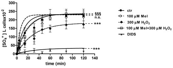 Time course of SO4= uptake in untreated erythrocytes (ctr) and erythrocytes treated with 300 µM H2O2, with or without pre-exposure to 100 µM Mel. n.s. not significant vs. ctr; *** p < 0.001 vs. ctr, 100 µM Mel + 300 µM H2O2 §§§ p <0.001 vs. 300 µM H2O2, as determined by one way ANOVA followed by Bonferroni’s post hoc test (N = 8).
