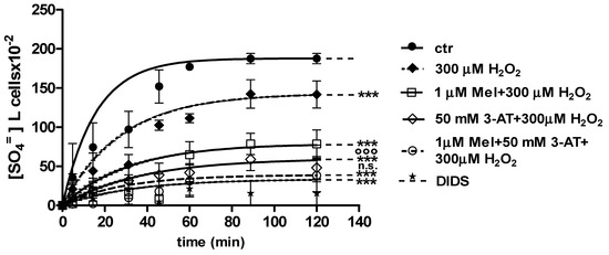 With regard to Figure 7, when 50 mM 3-AT and 100 µM Mel were applied before 300 µM H2O2 treatment, the rate constant for SO4= uptake (0.077 ± 0.001 min−1) was not significantly different with respect to both control (0.076 ± 0.001 min−1) and 100 µM Mel + 300 µM H2O2 treatment (0.074 ± 0.001 min−1). This latter value was significantly higher than that one determined after 300 µM H2O2 treatment (0.046 ± 0.001 min−1, Table 1). SO4= amount trapped by erythrocytes treated with 50 mM 3-AT + 100 µM Mel + 300 µM H2O2 was 219 ± 17 (Table 1).