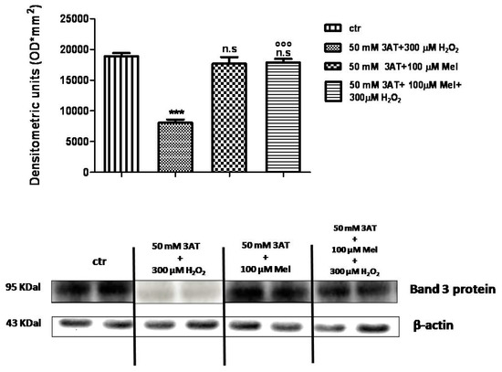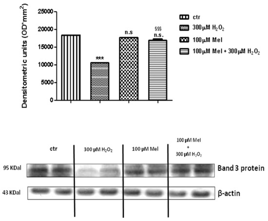 Expression levels of Band 3 protein measured in untreated erythrocytes (ctr), or in 300 µM H2O2- or in 1 µM Mel or in 1 µM Mel + 300 µM H2O2-treated erythrocytes, detected by Western blot analysis. *** p < 0.001 vs. ctr; n.s. not significant vs. ctr, as determined by one way ANOVA followed by Bonferroni’s post hoc test (N = 5).