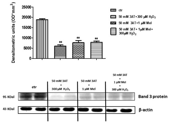 Expression levels of Band 3 protein measured in untreated erythrocytes (ctr), or in 50 mM 3-AT + 300 µM H2O2- or in 50 mM 3-AT + 1 µM Mel or in 50 mM 3-AT + 1 µM Mel + 300 µM H2O2-treated erythrocytes, detected by Western blot analysis. ** p < 0.01 vs. ctr; as determined by one way ANOVA followed by Bonferroni’s post hoc test (N = 5).