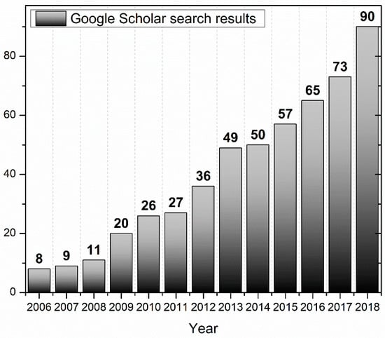 Number of articles published per year mentioning word “aquaphotomics” since 2006. The numbers are obtained using Google Scholar web search engine for articles and patents (excluding citations) containing word “aquaphotomics”.