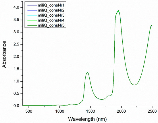 Spectra of pure water (produced by Milli-Q water purification system (Millipore, Molsheim, France) in the visible-near infrared region (400–2500 nm). Five spectra (miliQ_consNr1, miliQ_consNr2, miliQ_consNr5) presented in the figure were acquired by illuminating the same water sample five times consecutively.