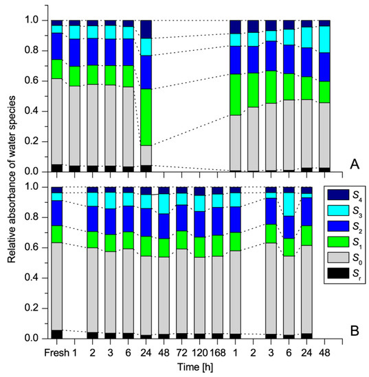 Dynamics of different water species (Si = water molecules with i hydrogen bonds, Sr = protonated water clusters) during dehydration and rehydration of Haberlea rhodopensis and Deinostigma eberhardtii. Relative absorbance of water species in Haberlea rhodopensis (A) and Deinostigma eberhardtii (B) during desiccation and subsequent rehydration [72].