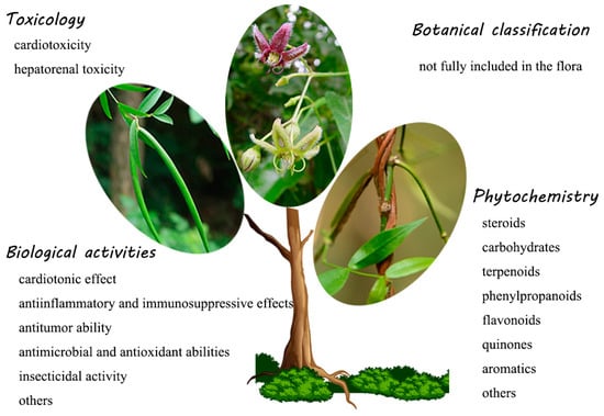 The genus Periploca belongs to the family Apocynaceae [1] and involves approximately ten species which are diffusely distributed in temperate Asia, southern Europe and tropical Africa [2]. Many species of this genus have been historically used as folk medicines in China, especially Periploca sepium and Periploca forrestii. The root bark of P. sepium, known as “Xiangjiapi” or “Bei-wujiapi,” is utilized as a traditional Chines medicine (TCM) for the treatment of rheumatoid arthritis and bone and muscle pain, which is recorded in the Chinese Pharmacopoeia (2015 version). The processing of Cortex Periplocae requires removing impurities, cleaning, slicing, and drying. The dried Cortex Periplocae (3~6 g) and other medicinal materials are decocted in water and taken for internal use [3]. The stems or the whole plant of P. forrestii, which is a well-known herb known as “Heiguteng,” are widely used by the Miao nationality in China to treat many diseases, including rheumatic arthritis, traumatic injury, stomachache, dyspepsia, and amenorrhea. The usage of P. forrestii is usually decocted in water or soaked in wine for internal use, or it is smashed for external application [4]. The title genus is abundant with an array of attractive metabolites, such as steroids, oligosaccharides, terpenoids, phenylpropanoids, and flavonoids. These novel and complex metabolites and various crude extracts from the genus Periploca have attracted increasing attention to intensive biological studies, indicating that they possess significant cardiotonic, anti-inflammatory, immunosuppressive, antitumor, antimicrobial, antioxidant, insecticidal and other properties. Some cardenolide-type steroids exhibit obvious cardiotonic and antitumor effects at a certain dose. Their strong immunosuppression and insecticidal potentials provide new development prospects for pregnane glycosides. In addition, cardiac steroids were also found to have latent toxicity. In the 2000s, several researchers provided reviews of the chemical constituents and biological activities of the genus Periploca [5,6]. However, these concise reviews were expressed in Chinese. Additionally, a large amount of scientific research results on this genus has emerged in recent years. To make researchers know elaborate information on the chemical and biological activities of the genus Periploca and to make a modest contribution to the rational application of this genus, a systematic review of the genus Periploca is imperative. We covered topics including the botanical classification, phytochemistry, biological activities and toxicology of the genus Periploca through a literature survey from 1897 to early 2019. The outline of this paper and some representative plants of the genus Periploca are shown in Figure 1.