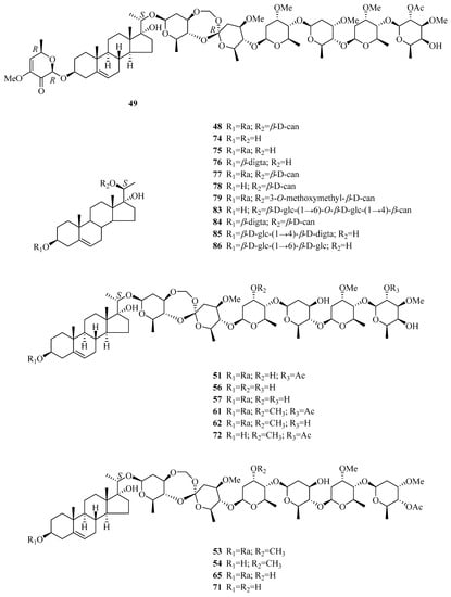 In addition to cardenolides, other types of compounds have been examined for their cytotoxic activities. Periseosides C (93) showed moderate inhibitory activity against the ConA-stimulated splenocyte proliferation in vitro [40]. Two C21 pregnane-type steroids (52,77) and four known oligosaccharides (168,155,162,163) were tested for their cytotoxicities against the A-549 and HepG2 human cancer cell lines with IC50 values ranging from 0.61 to 7.68 μM by Wang’s group [43]. Interestingly, compound 168, a derivative of 163 with the acetyl group at C-2 of the β-D-digitalopyranosyl moiety, exhibited moderate activities, while 163 and others were not active, which implied that the presence of an acetyl group might be related to the cytotoxic activity. Besides, Shan’s group discovered that baohuoside-I (255) restrained the proliferation of and arrested Eca109 human esophageal squamous carcinoma cell cycles, which might be associated with the downregulation of Cyclin B1 mRNA expression [159]. As the research continued, they reported that baohuoside-I (255), by inhibiting β-catenin-dependent signaling pathways, significantly inhibited the proliferation of the cells in a time- and dose-dependent manner with the IC50 value of 24.8 μg/mL at 48 h and induced apoptosis of Eca109 cells in vitro and in vivo [160]. Coincidentally, lupeal acetate (198) was also found to reduce the incidence of N-nitrosomethylbenzylamine-induced esophageal tumors from 93.3% to 33.3% in rats after twenty-five weeks of treatment, which might have occurred through the activation of glycogen synthase kinase-3β expression and the inhibition of β-catenin and c-myc expression [161].
