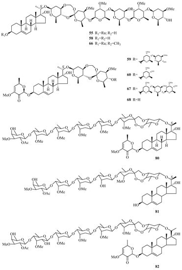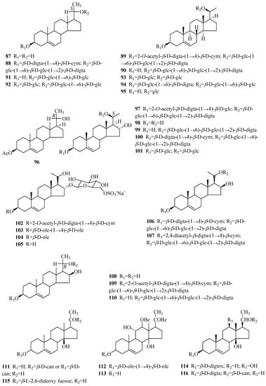 Compounds 97–106 are characterized by the inclusion of two hydroxyl groups at C-16 and C-20 of the aglycones, and the configuration of C-16 was deduced to be α. Glycoside H2 (97) was found by Sakuma and co-workers [53] in 1980, and it showed significant potentiation of the effect of nerve growth factor. The hydrolysis of compound 97 yielded glycoside 98. Due to a hydroxyl group at the D-ring, plocoside B (100) was found to exhibit higher differentiation-inducing activity [51]. Periseoside E [40] (101), along with periseosides A–D, was obtained in 2011. The study of the small branches of P. graeca collected at Marina di Vecchiano, Italy resulted in five new pregnane glycosides (102–106). It is worth mentioning that 102–105 are characterized by a 6-sulfated-β-d-glucopyranosyl unit at C-16, and the occurrence of sulfated glycosides as pregnane derivatives is an unusual finding [50]. Compound 106 bears a hydroxyl group in the β configuration at C-16. Compound 107 [29] is similar to 106, with the difference between them being in the structures of the oligosaccharide moieties. Compounds 108–110 are equipped with the R configuration at C-20 and a β-oriented hydroxyl group at C-16.