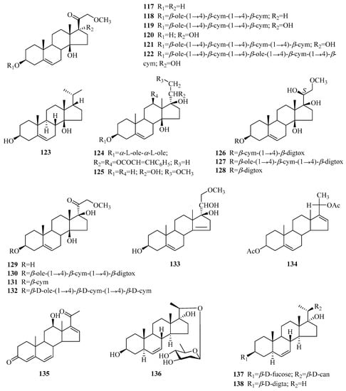 Six C21 steroidal glycosides (117–122) have the chemical framework of 21-methoxypregnane-20-one and feature a β configuration hydroxyl group at C-14, five of which are new compounds. Ye and co-workers [44] found that compound 117 was biogenetically connected to (3β,5β,14β)-3,14,21-trihydroxypregnan-20-one, which is a precursor of cardenolides. In addition, the presence of compound 117 could indicate the pregnane pathway for the biosynthesis of cardenolides in P. sepium. Perisepiumoside E (118) [58], a glycoside of 117, was isolated in 2008. Two years later, a new pregnane glycoside (119) with an α-oriented hydroxyl group at C-17, together with its known pregnane genin (120), was obtained [18]. In comparison with compound 120, the pregnane glycosides 121 and 122 [43] contain disparate saccharide chains.