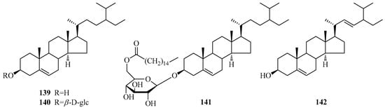Compounds 172–185 are a series of oleanane-type triterpenes. In 1971, oleanolic acid (172), together with maslinic acid (175), was first isolated from the genus Periploca [70]. Two known triterpenes (177,178) [10,87] characterized by a 13,28-lactone ring were discovered from P. laevigata and P. somaliensis, respectively. Additionally, three new triterpenoid acids of the oleanane series, named P1, P2, P3 (183–185), were isolated from the twigs of P. calophylla, without definite chemical structures [89]. Eleven ursane-type triterpenes (186–196) were found in the species of genus Periploca. Ursolic acid (186) [94] was acquired in 1987 from P. nigrescens. Moreover, these triterpenes also illuminated a new triterpene (196), which also has a 13,28-lactone ring [94]. Compounds 197–207 are triterpenes of the lupane type, and seven (197–203) of them were obtained from the latex of P. laevigata collected in Tunisia [87]. In addition, compounds 199–204 have the characteristic of a long-chain alkanonic ester or a β-hydroxy fatty acid ester at C-3. The structures of two new triterpenes (205,206) from P. aphylla resembled each other very closely, but the remarkable difference was in the substituent at C-3. Due to the difference, compound 205 exhibited strong inhibition of α-glucosidase type VI and a temperate antibacterial activity, while 206 was inactive or weak [67]. There are three cycloartane-type triterpenes (208–210) [92] with a hydroxyl group in the β configuration at C-3 which were isolated from this genus for the first time.