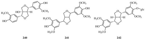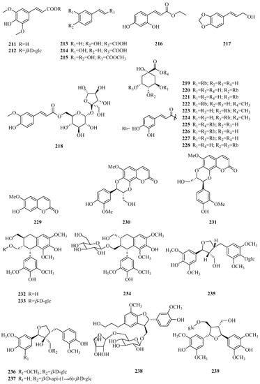 To date, thirty-two phenylpropanoids (211–242) have been reported, and they are divided into three categories: Simple phenylpropanoids, coumarins, and lignans. Their structures, names, corresponding sources, parts of plants and references are illuminated in Table 5 and Figure 7. Compounds 211–228 are simple phenylpropanoid compounds, among which compounds 219–228 [74] are a series of caffeoylquinic acids which were isolated from the hydrosoluble fraction of P. forrestii for the first time in 2017. Scopoletin and cleomiscosins A and B (229–231) are the only three coumarins from Periploca species [66,97]. In addition, there are eleven lignans (232–242). (+)-lyoniresinol (232) is an arylnaphthalene-type lignin [84], while tortoside B (235) is a tetrahydrofurane-type lignan [98]. Two new tetrahydrofurane-type lignins (236,237), along with four known lignans (233,234,238,239), were determined from P. forrestii in 2017 [63]. In addition, the remaining three compounds 240–242 appear as furoferran-type lignins [8,73,99].