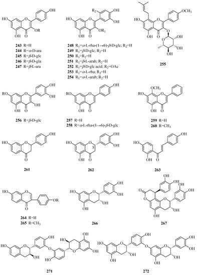 A great variety of flavonoids (243–273, Table 6, Figure 8) have been isolated and identified from this genus, and most were obtained in the past fifteen years. Familiar flavonols, such as kaempferol, quercetin and their derivatives (243–256), are also found in Periploca species. Compounds 257–260 are four simple flavones, while 261 and 262 are two common flavanones. There are three usual chalcones and isoflavones (263–265). The genus Periploca is also characterized by containing flavanes (266–272) [63,84]. Moreover, (−)-maackiain (273) is a pterocarpan [45].
