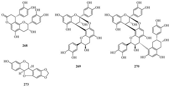 The antioxidant capacity of phenols is intimately related to their content and the number of hydroxyl groups. The methanol extract with the highest contents of phenolics and flavonoids from P. laevigata displayed the greatest antioxidant properties, followed by the water and ethyl acetate extracts [174]. Intriguingly, six lignins (236,237) were evaluated for their antioxidant abilities, and they showed no or minor antioxidant activities. Feng’s group illustrated the probable structure-activity relationship. The more original hydroxyl groups of phenols are replaced by methoxyl groups, the lower the antioxidant activity is [63]. They also detected that flavanes (266–268,270) which exerted high radical-scavenging activities with IC50 values ranging from 14.61 to 28.80 μM. Additionally, aesculitannin B (270), a flavane trimer, was able to shrink α-melanocyte-stimulating hormone-induced melanogenesis by inhibiting the expression of microphthalmia-associated transcription factor and tyrosinase in a dose-dependent manner, owing to the multiple phenolic hydroxy groups [63]. Bisflavan-3-ols 271 and 272 from the ethyl acetate fraction of P. aphylla displayed evident inhibitory potential against the enzyme lipoxygenase with IC50 values of 19.7 and 13.5 μM. Malik and co-workers speculated that the stereochemistry of 272 was probably more conducive to the inhibition of lipoxygenase enzyme than that of 271 [84].