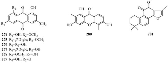 A total of eight quinone compounds (Table 7, Figure 9) has been found in the genus Periploca, and seven of them were derived from P. forrestii. Compounds 274–279 are six emodin-type anthraquinones. An anthrone (280) was reported for the first time from P. aphylla [84]. Additionally, tanshinone IIA (281) [111] possesses a diterpenoid quinone skeleton, which was discovered from the portion of P. forrestii with anti-inflammatory activity.