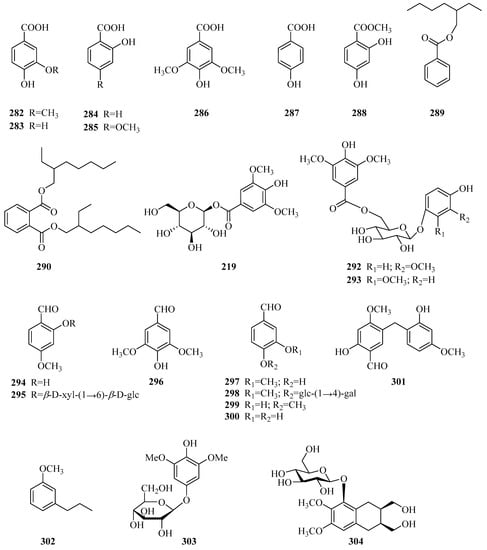 Twelve aromatic acids and their derivatives 282–293 (Table 8, Figure 10) were discovered from the genus Periploca. These carboxylic acid groups could be esterified with alkanols or form ester glycosides with sugar moieties. Aromatics 294–301 are eight aromatic aldehydes and their derivatives. 4-methoxy salicylaldehyde (294) was first reported in the bark of P. graeca in 1935 [113]. Compound 301 is a new diphenylmethane [44]. Compounds 302 and 303 are two aromatic ether compounds, and a new naphthalene derivative named periplocain A (304) [108] was discovered in 2016.