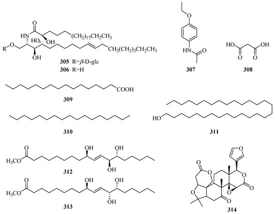 Two ceramide compounds 305 and 306 were obtained from the trichloromethane fraction of the 80% alcohol extract of P. forrestii for the first time in 2014 [116]. There are six aliphatic compounds (308–313) and two stereoisomeric fatty esters (312,313) [63]. Obaculactone (314) is a lactone [80]. Their structures, names, corresponding sources, parts of plants and references are showed in Table 9 and Figure 11. Additionally, it should be noted that some researchers have reported that the plants of genus Periploca are rich in volatile oils, whereas the volatile oil components detected online are not listed in detail in this paper.