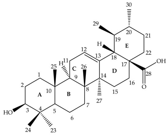Ursolic acid (3 β-hydroxy-urs-12-en-28-oic acid) is a pentacyclic triterpenoid composed of a C-30 chemical structure built from isoprenoid units with A, B, C, D and E rings (Figure 1) [51]. UA may occur as an aglycone or free acid of saponins [52,53]. UA has a low solubility in water, but high solubility in alcoholic sodium hydroxide (NaOH) and glacial acetic acid [54,55,56,57]. The UA chemical formula is C30H48O3, with a melting point of 283–285 °C. The properties of the UA structure indicate that it has a molecular weight of 456.7g/mol [20,52,53,58]. UA is mainly biosynthesized by folding and cycling squalene from a dammarenyl cation, which makes the third UA ring by expanding the ring and creating an added ring [58]. The biosynthesis of UA found in plant cells originates from the cyclical (3S)-oxidosqualene cycling. The predominant (3S)-oxidosqualene predecessor is converted into a cationic dammarenyl structure undergoing chain growth and other cyclic changes in order to form this third distinct ring, which is present in the α-amyrin skeleton, a nucleus in the UA [51].