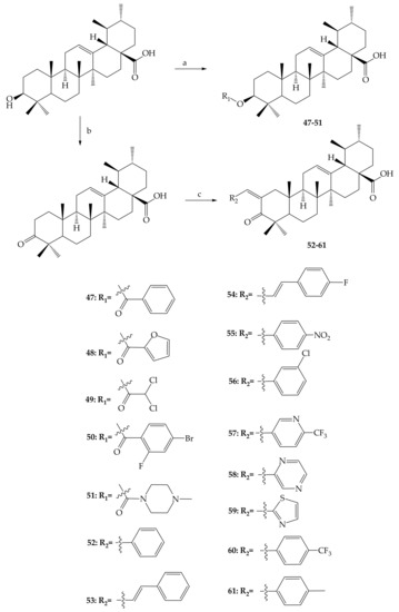 Wu and colleagues (2017) produced several UA derivatives (47–61) in an effort to study the greater power and bioavailability of the UA by adding an acyl group at position C-3 to make the most of the structure-activity relationship. They further synthesized ester derivatives by a process of esterification with suitable acid chlorides in the presence of a DMAP catalyst. In addition, Claisen Schmidt condensation and Jones oxidation steps at positions C-2 and C-3, respectively, were used for bioactive UA derivatives (Figure 8) [62].