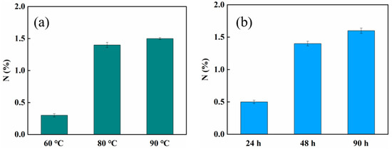 The synthesis route of MCM-g-AB15C5 is illustrated in Figure 1. According to our previous work, MCM-g-PGMA with different grafting yields could be prepared by pre-irradiation-induced emulsion graft polymerization of GMA onto MCM by regulating the absorbed dose and concentration of monomer [25]. Considering the content of functional groups and physical performance of functionalized MCM, the MCM-g-PGMA with a grafting yield of 81% was synthesized from 2.0 g MCM reacted with 2.1 g GMA and used in the following chemical reaction with AB15C5. In order to favor the nucleophilic substitution reaction between PGMA grafted onto MCM and NH2-group in AB15C5, DMF was used as a solvent to improve the ring-opening reaction of PGMA. Then we studied the effect of reaction temperature and time on the content of AB15C5 onto grafted MCM. After the chemical reaction, the N element which only comes from AB15C5 could be measured in the resultant modified MCM-g-PGMA, indicating the successful synthesis of MCM-g-AB15C5. As shown in Figure 2, the amount of N element in MCM-g-AB15C5 increased with the increase of reaction temperature from 60 to 90 °C (Figure 2a) and the increase of reaction time from 24 h to 90 h (Figure 2b). According to the above results, suitable reaction condition is chosen to be 80 °C and 48 h.
