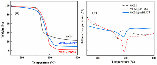 TGA curves (a) and DTA curves (b) of MCM, MCM-g-PGMA and MCM-g-AB15C5.