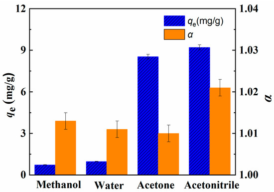 Effect of solvent on the adsorption uptake of Li+ and separation factor of isotopes by MCM-g-AB15C5 (adsorption condition: CF3COOLi, [Li+] = 1 g·L−1, 25 °C).