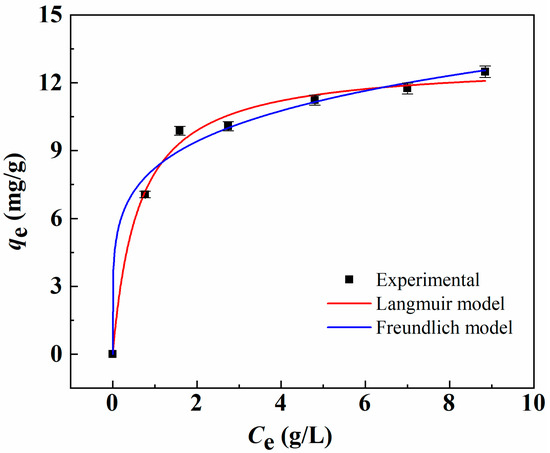 where qm is maximum adsorption capacity. Ce and KL are the equilibrium concentration of solution Li+ and the Langmuir adsorption constant [22], respectively. The Freundlich isotherm adsorption model can be shown in Equation (2):