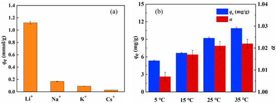 Additionally, the selectivity of MCM-g-AB15C5 to Li+ was evaluated, which is important for their practical application. Different alkali metal ions, including Na+, K+ and Cs+ with a concentration of 1.0 g·L−1 for each ion were introduced into the acetonitrile as coexisting ions. As shown in Figure 9a, the MCM-g-AB15C5 absorbent exhibits selective binding ability towards Li+ against the competing metal ions with the order Li+ >> Na+ > K+ > Cs+. It is attributed to the cavity size fitting of the AB15C5 ligands with Li+. The selectivity factors (SF) were calculated to be SFLi/Na = 2.4, SFLi/K = 2.8, and SFLi/Cs = 3.1, respectively. The SF can be described by the following Equation (3) [20].