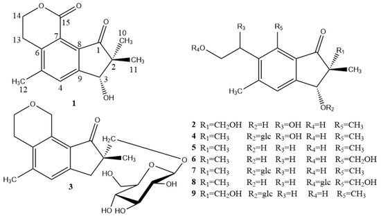 The genus Pteris (Pteridaceae) comprises about 300 species, which are mainly distributed over the tropical and temperate zones throughout the world. There are about 66 species of the genus in China, especially in South and Southwest of China [1]. Pteris is commonly known as “Jue-Cai” in Chinese. Most species of this genus such as Pteris multifida, Pteris cretica, and Pteris nervosa are used as traditional Chinese medicines to clear heat, remove dampness and cool blood in medical practice [2]. In recent years, the phytochemical investigation of this genus has resulted in the isolation and identification of sesquiterpenoids (known as pterosins), diterpenes, flavonoids and various quinic acids [3,4,5]. Among of above secondary metabolites, pterosins, illudane-type sesquiterpenoids are most significant characteristic constituents of Pteris. Moreover, pterosins are used as the chemical markers for Pteridaceae [6]. Pterosins can be classified into three categories according to the number of skeletal carbon, such as 13 carbon, 14 carbon and 15 carbon pterosin derivatives [6,7]. Pharmacological investigations showed that pterosins had many bioactivities, such as antitumor, anti-inflammatory, anti-diabetes and anti-tuberculosis properties [8,9,10,11]. However, most studies on pterosins from this genus focused on Pteris multifida [7]. Other species of the Pteris genera probably possess pharmacological activities and bioactive secondary metabolites that are similar to Pteris multifida. As a part of our ongoing research aimed at finding potentially bioactive components from medicinal plants of the genus Pteris [12,13,14], we have carried out a detailed phytochemical investigation of the aerial parts of Pteris cretica Linn. (P. cretica). Herein described are the isolation and structural elucidation of nine pterosins, including four pterosins (compounds 1, 2, 5 and 6), along with five pterosides (compounds 3, 4 and 7–9).
