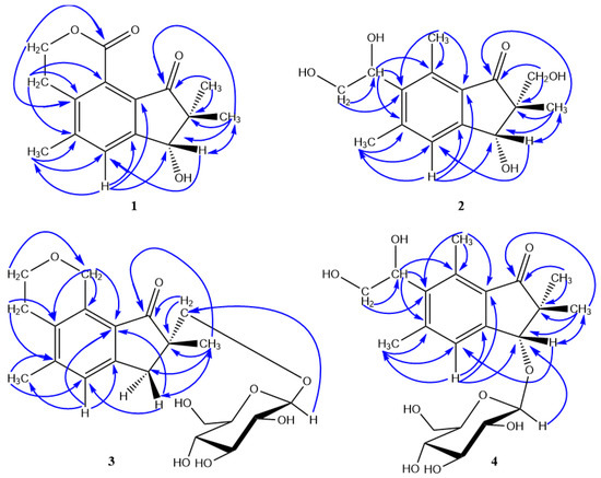 The key HMBC (→) and NOESY (↔) of compounds 1–4.