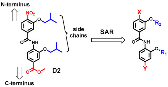 The structure of D2 and the structure-activity relationship study at the N/C-terminus (X and Y) and side chains (R1 and R2).