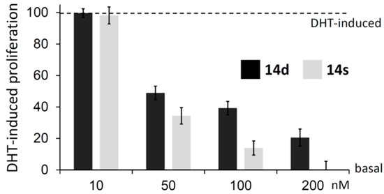We next examined the specificity of compounds 14d and 14s for the cell growth inhibition. Compounds 14d and 14s have little effect on the transcription of AR target genes in the absence of DHT (Figure 4c). In addition, cell proliferation was unaffected by 14d and 14s in the absence of DHT (Supplementary Materials Figure S1a), suggesting compounds 14d and 14s are dependent on androgen for their inhibitory activity. The specificity of compounds 14d and 14s for the cell growth inhibition was also tested using AR-negative PC3 prostate cancer cells. While 14d and 14s were effective in inhibiting AR-positive LNCaP cells (Figure 3), they had no effect on the growth of PC3 cells, confirming that the antiproliferative properties are specific to AR-dependent PCa cells (Supplementary Materials Figure S1b).