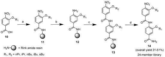 The library synthesis commenced with the loading of 3-alkoxy-4-nitrobenzoic acids 10 onto Rink amide resin (Scheme 2). The nitro group of 11 was then reduced with tin (II) chloride under acidic conditions. The resulting amines 12 was reacted with 3-alkoxy-4-nitrobenzoic acids 10 using HATU to form a resin-bound bis-benzamides 13. After cleavage with TFA, 24-membered bis-benzamide library 14 was prepared in high purity (92%–99%) [21].