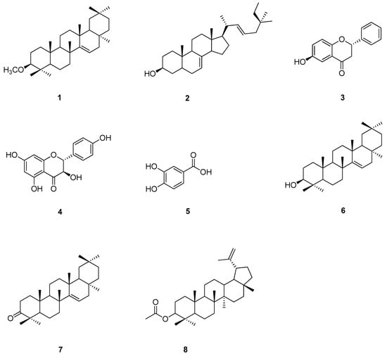 Chemical structures of isolated compounds from M. zapota bark: taraxerol methyl ether (1); spinasterol (2); 6-hydroxyflavanone (3); (+)-dihydrokaempferol (4); 3,4-dihydroxybenzoic acid (5); taraxerol (6); taraxerone (7); and lupeol acetate (8).