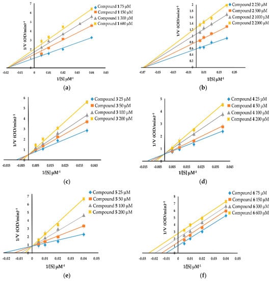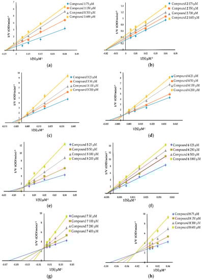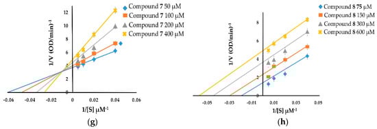 Lineweaver–Burk plots of compounds 1–8 showing monophenolase inhibitory activity: (a) taraxerol methyl ether (1); (b) spinasterol (2); (c) 6-hydroxyflavanone (3); (d) (+)-dihydrokaempferol (4); (e) 3,4-dihydroxybenzoic acid (5); (f) taraxerol (6); (g) taraxerone (7); and (h) lupeol acetate (8).
