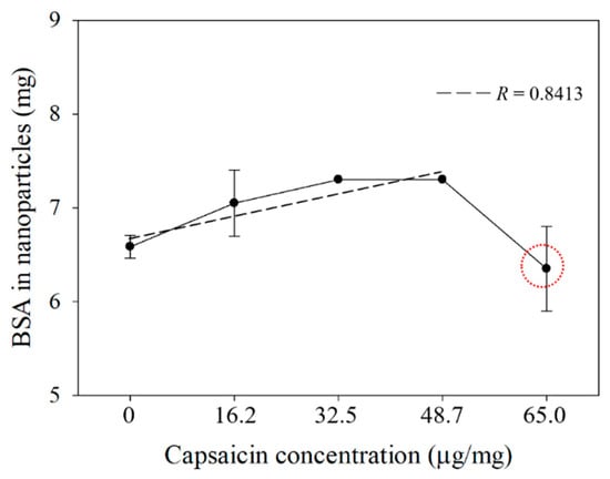 BSA protein transformed into nanoparticles as a function of capsaicin concentration. The quantified protein showed a linear tendency (R = 0.8413) in relation to the concentration. Values are means of three experimental replicates ± standard deviations.