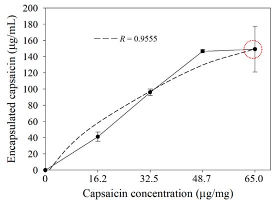 Encapsulated capsaicin in nanoparticles with respect to the concentration. The quantified capsaicin showed a logarithmic tendency (R = 0.9555). Values are means of three experimental replicates ± standard deviations.
